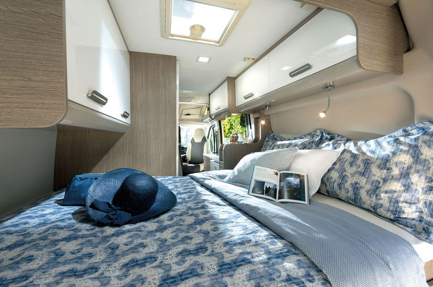 Das Wesentliche für die Familie – der Alkoven ist das klassische Familien-Reisemobil mit Schlafnische und Doppelbett über der Fahrerkabine.
